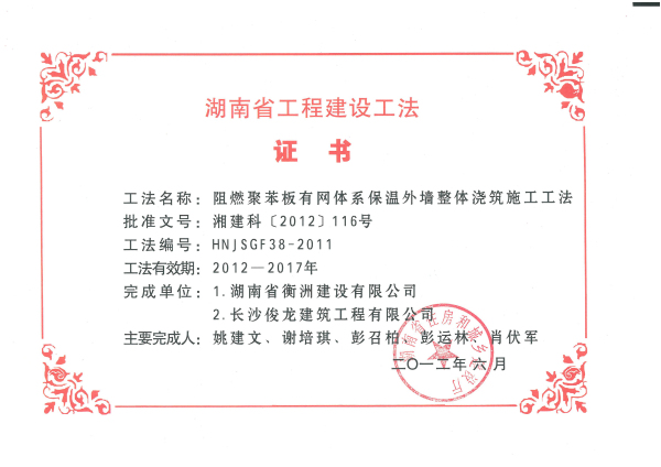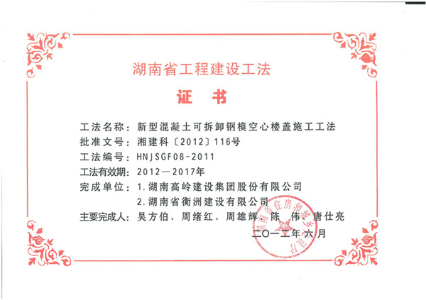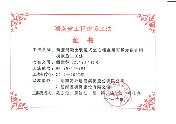 湖南省2011年度省級(jí)工法證書