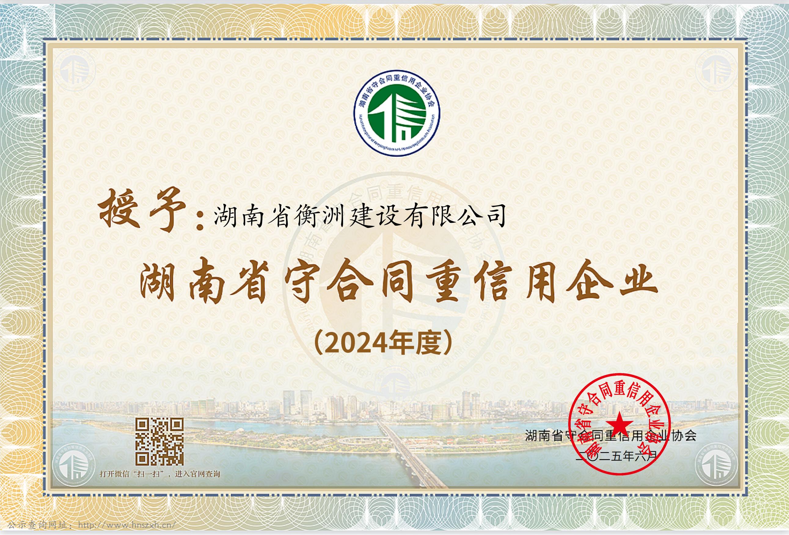 近日,湖南省守合同重信用協(xié)會(huì)正式公布 2024 年度 “湖南省守合同重信用企業(yè)” 名單,湖南省衡洲建設(shè)有限公司憑借卓越的信用管理水平與良好的市場(chǎng)信譽(yù)再度登榜。這是衡洲建設(shè)自1999年以來(lái),第24次獲得湖南省“守合同重信用企業(yè)”殊榮。